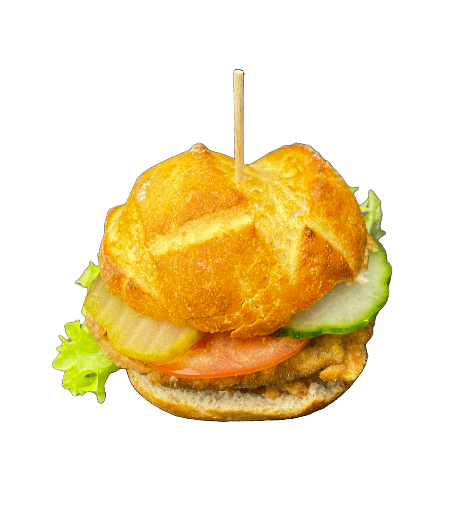 Vegan Burger – köstlicher Linsen-Burger im BIO-Kartoffelweckerl mit Vegan Mayo, Senf, frischem Salat, Tomaten, Gurken und Röstzwiebeln.