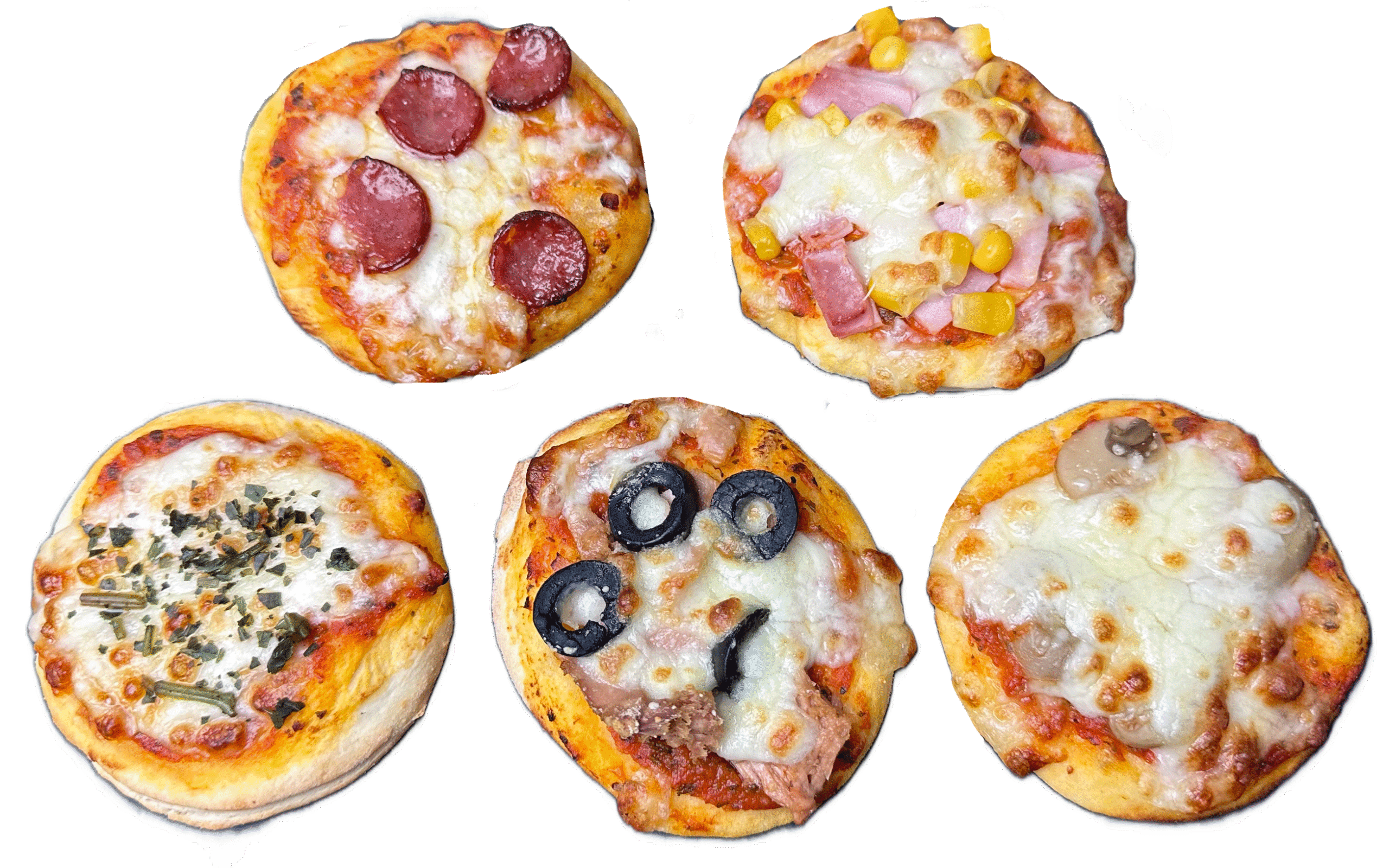 Mini-Pizza – kleine italienische Klassiker aus hochwertigem Mehl, auf Semola geknetet und mit selbstgemachter Tomatensauce belegt. Erhältlich in fünf Sorten: Salami, Schinken-Mais, Champignon, Thunfisch und Margherita. Ideal als Fingerfood für jede Feier.