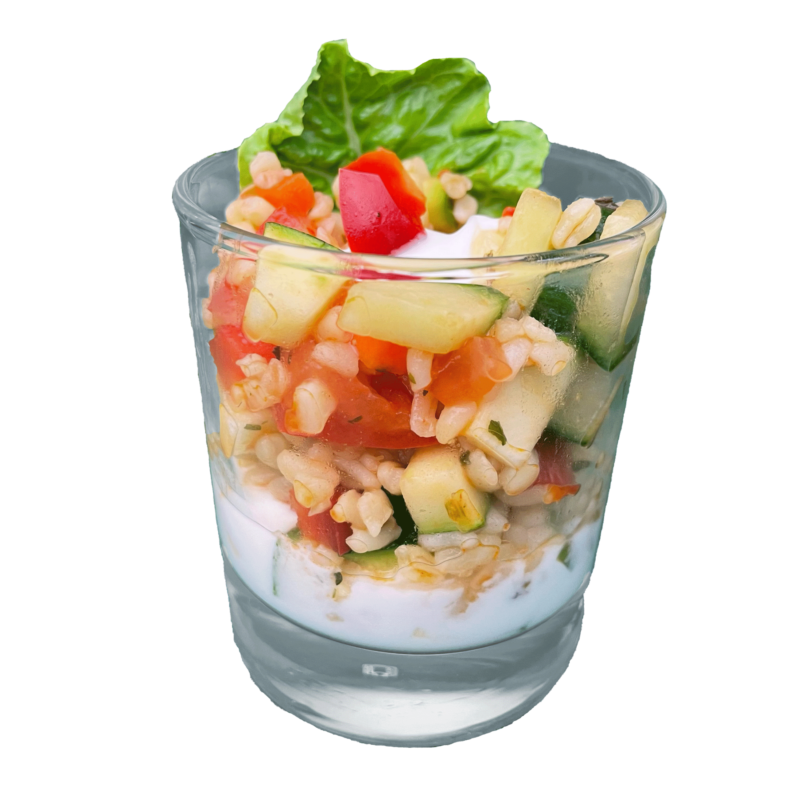 Glassalat Bulgur Vegan – Bulgursalat vegan bestellen in Wien: fein mariniert auf Sweet-Chili-Sauce und mit frischem Gemüse garniert. Der leichte, gesunde Genuss im Glas – ideal für Catering, Buffet oder Fingerfood.