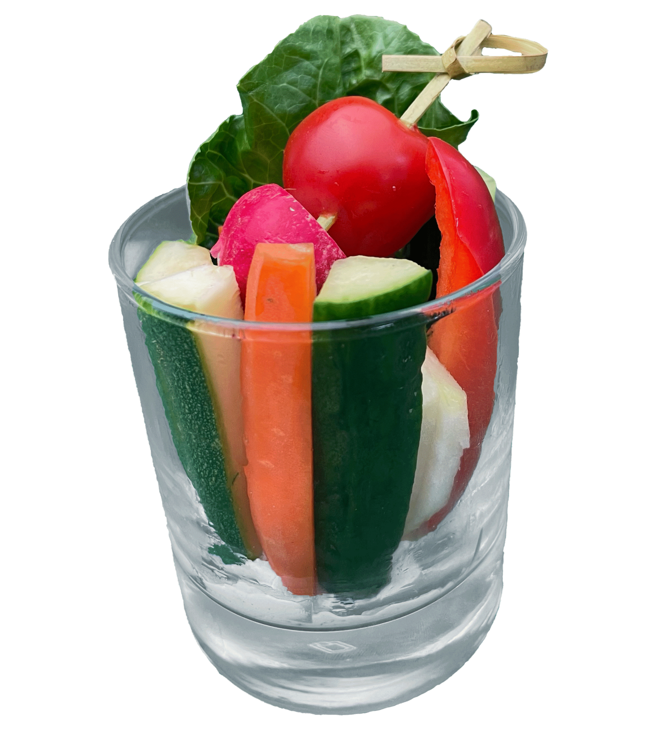 Rohkoststicks im Glas – Rohkost im Glas bestellen in Wien: knackige Gemüsesticks als handliche Einzelportion, serviert mit cremigem Kräuter-Frischkäse-Dip. Frisch, leicht und ideal für Catering, Buffet oder als gesunder Snack.