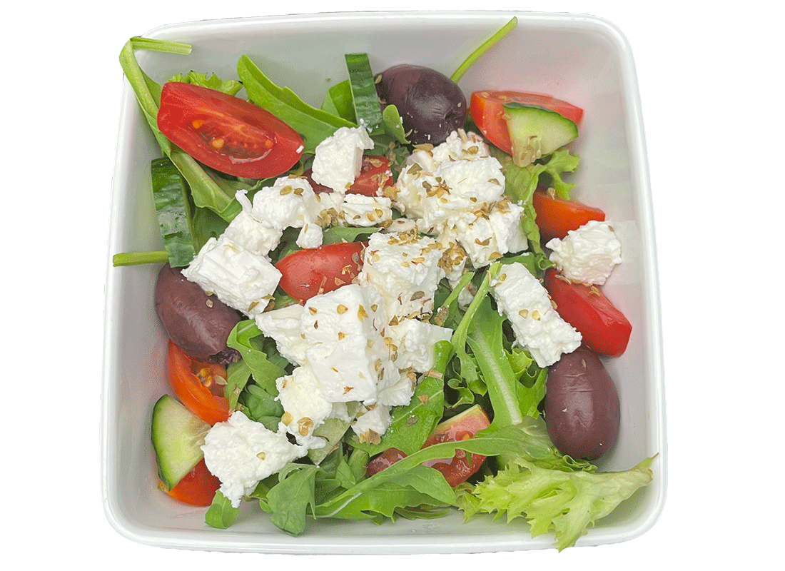Salat griechisch mit Feta – Griechischen Salat bestellen in Wien: einzelne Portion mit cremigem Fetakäse, Oregano, Tomaten, Gurken und original griechischen Kalamata-Oliven. Frisch zubereitet, leicht und ideal für Catering, Buffet oder als gesunder Snack.