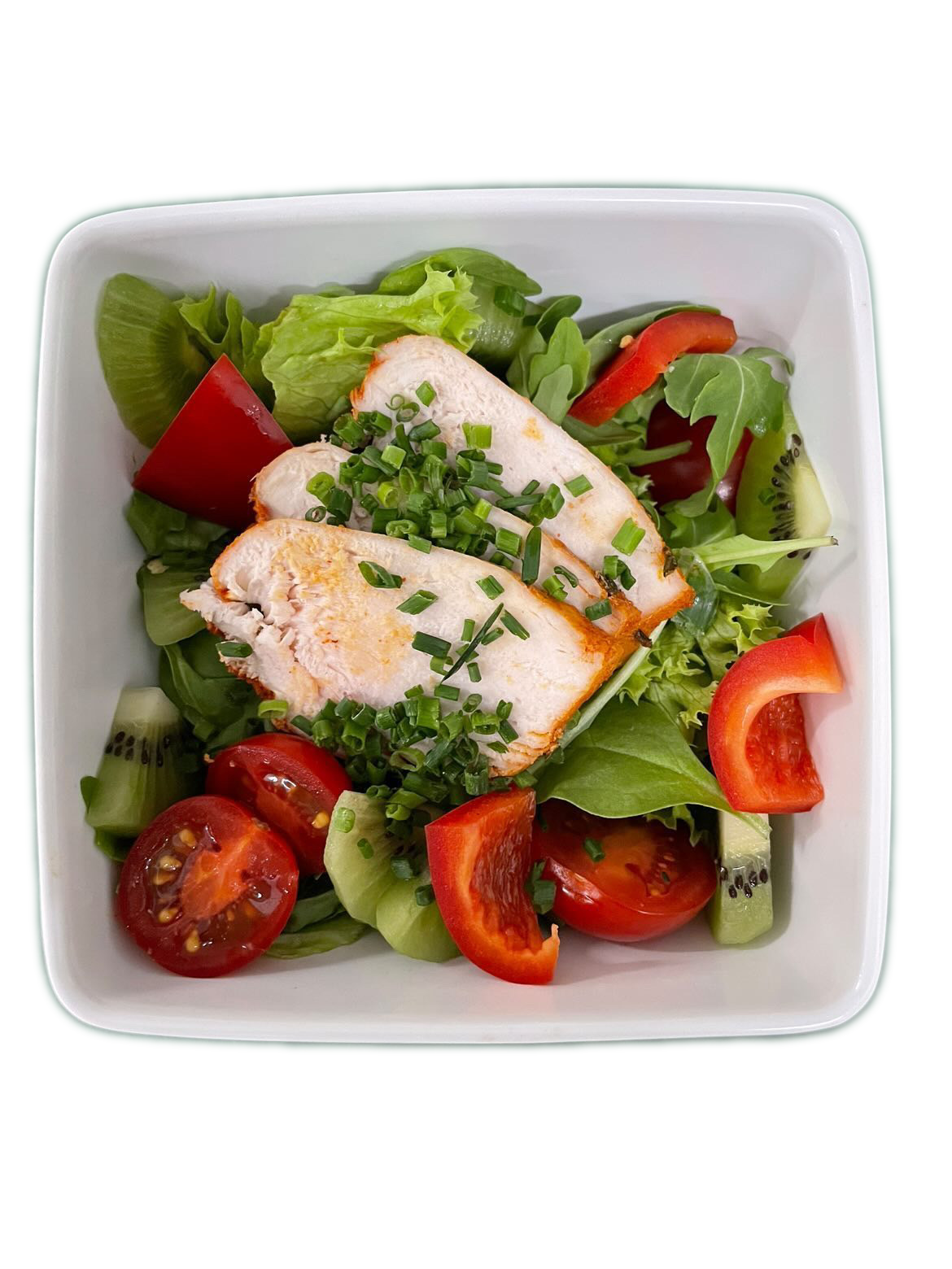 Salat mediterran mit Huhn – Mediterranen Hühnersalat bestellen in Wien: einzelne Portion mit zart gebratenen Hühnerscheiben, roter Paprika, Kirschtomaten, Kiwi und frischem Blattsalat. Frisch, leicht und ideal für Catering, Buffet oder als gesunde Mahlzeit.