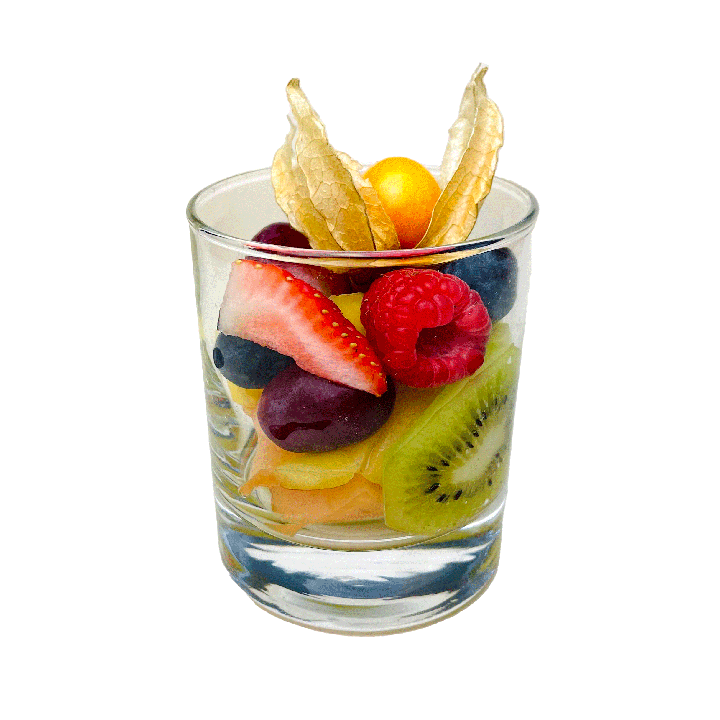 Fruchtsalat im Glas – Fruchtsalat in Wien bestellen: bunte Mischung aus saisonalem Obst, frisch geschnitten und dekorativ im Glas serviert. Ab 5 Stück erhältlich, perfekt für Meetings, Catering oder Büro-Pausen.