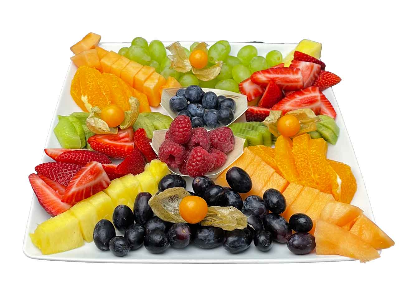 Schnittobst pro Portion – buntes Obst frisch geschnitten, 5 Portionen als Regenbogen-Arrangement. Gesunde, farbenfrohe Abwechslung für Meetings, Buffets oder Büro-Catering.