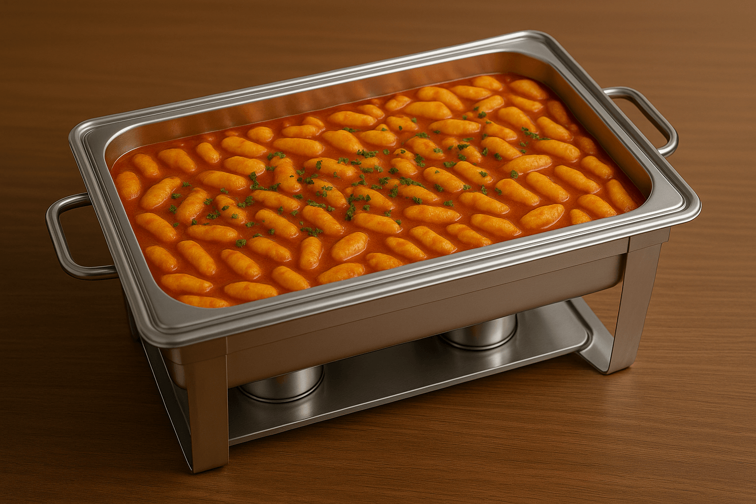 Unsere hausgemachten Gnocchi werden in einer aromatischen Tomatensauce mit frischem Spinat geschwenkt und mit Feta verfeinert. Dieses vegetarische Gericht kombiniert mediterrane Aromen mit cremiger Textur – leicht, sättigend und ideal für warme Caterings, Business Lunch oder Flying Buffets. Eine beliebte Wahl für alle, die es fleischlos, aber geschmackvoll mögen.