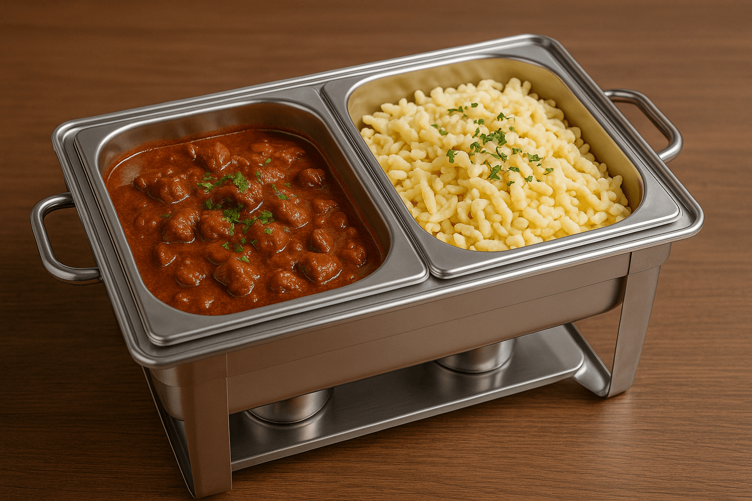 Kräftig geschmortes Rindergulasch mit Paprika, und viel Zwiebel. Traditionell zubereitet, serviert mit Nockerl, Kartoffeln oder Spätzle. Herzhaft, sättigend und beliebt bei Firmenkunden.